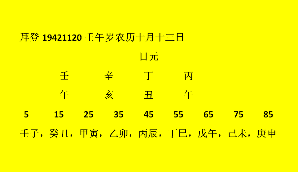 比肩劫财为兄弟姐妹星,鉴于乔·拜登八字命局中丁火日主弱,壬水官星强旺之势,格局全靠年支時支午火之根来帮身敌官,午火为喜用神,说明其兄弟姐妹情仪及帮扶之力不小,在那些可以自由生育的年代及社会背景下,从午支中藏干主体的丁火之数,己经有二个午支中的丁火比肩兄弟,午支又为丁火之禄地,禄是兄弟姐妹数重叠之数,双重禄也可算二个兄弟姐妹,总共加数和为四个兄弟姐妹也属八字论兄弟姐妹的正确论法,而鉴于乔·拜登是其四个兄弟姐妹中的老大排行及四个数之特点,子午卯酉排行为一、四、七的说法,推演其为午時的依据也就比较合理。