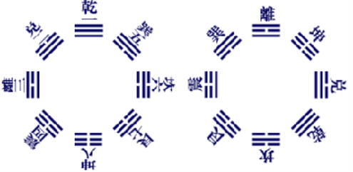 八卦五行;乾宫属金为阳;坤宫属土为阴;震宫属木为阳;巽宫属木为阴;坎宫属水为阳;离宫属火为阴;艮宫属土为阳;兑卦属金为阴。八卦有先天八卦、后天八卦,先天为体、后天为用。先天八卦易数;乾一、兑二、离三、震四、巽五、坎六、艮七、坤八。后天八卦化九宫数;坎一、坤二、震三、巽四、中五、乾六、兑七、艮八、离九。