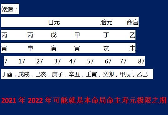 此命局既然属杀印相生格,偏印丙火用神及杀星甲木喜神不能伤不许杂,而现在的大运行的是乙巳,2020年庚子流年庚金克命局甲木杀星喜神,丙火枭神又克夺食神庚金,乙巳大运与流年天干庚金又合化成金齐克甲木,乙与甲又是官杀混杂,一片刑战克害混杂之势,老年岁运者遇之不利,故命主本人在2020年虚岁95岁应该就已经是有较大病变之事的发生。2021年虚岁本年96岁流年辛丑,大运乙巳,除了乙与甲官杀混杂外,流年辛干直克命局中喜神甲木,辛与丙合,合去用神丙火都是大不利之兆,更甚者命主的命宫“乙未”被流年辛丑天克地冲,本年从农历三月壬辰月开始至六月乙未月特别是乙未月应该有病危之象,辛丑年六月乙未月逃过到了腊月辛丑月也应该是个危险的关厄。2022年虚岁97岁,交大运丙午,流年壬寅,大运午火为命主羊刃,老人怕行身旺运,况且午丁火与丙成正偏印混杂,流年壬寅的天干壬水直克命局丙火,流年支寅又再次冲起局中申金驿马,此为第一不利;命主命宫在“乙未”,身宫在“庚午”,大运在丙午与命局丙火同克身宫天干庚,论身体健康条件看命宫和身宫为重,命宫重地支,身宫重天干。命宫身宫被伤克影响健康,此是第二个不利。所以,本命主虚岁96岁辛丑(2021),97岁壬寅(2022)年应该就是寿元的极限之期。应该不可能熬到100周岁的丙午流年吧!