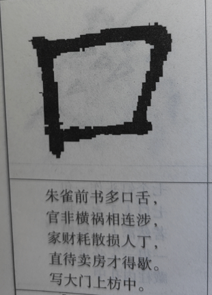 朱雀前书多口舌、官非横祸相连涉、家财耗散损人丁、直待卖房才得歇。写大门上枋中。