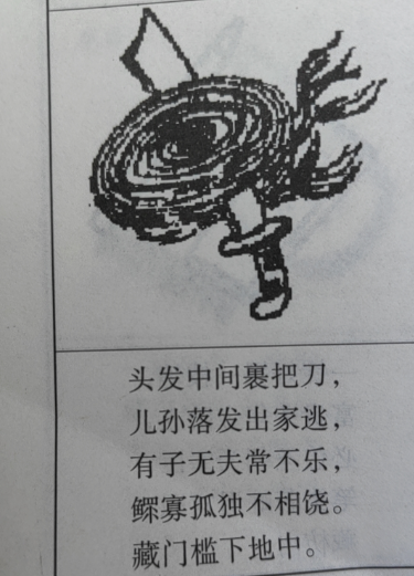 头发中间裹把刀,儿孙落发出家逃,有子无夫常不乐,鳏寡孤独不相饶。藏门槛下地中。