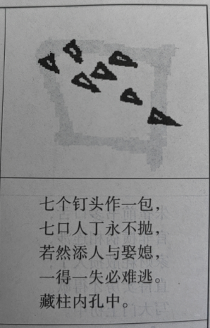 七个钉头作一包,七口人丁永不抛,若然添人与娶媳,一得一失必难逃。藏柱内孔中。