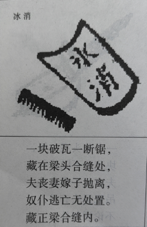一块破瓦一断锯,藏在梁头合缝处,夫丧妻嫁子抛离,奴仆逃亡无处置。藏正梁合缝内。
