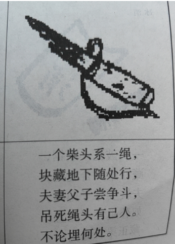 一个柴头系一绳,块藏地下随处行,夫妻父子尝争斗,吊死绳头有已人。不论埋何处。
