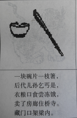 一块碗片一枝箸,后代儿孙乞丐是,衣粮口食尝冻饿,卖了房廊住桥寺。藏门口架梁内。