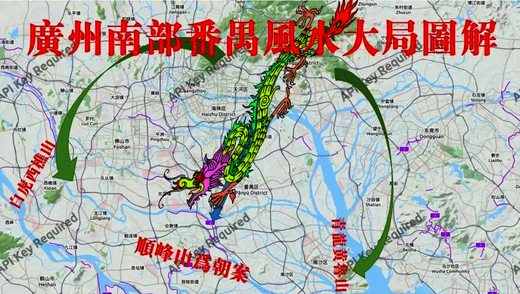 要理清番禺的龙脉与风水格局,就要先了解广州中心(海珠区)市区的龙脉来源,风水龙脉看法诀窍:看龙先看水,龙脉的延伸,必有水源伴随着龙脉延伸而流行,也即是龙脉往那处方向延伸游走其左右就必会有一条水流伴随龙行的方向流动,所以水流的源头也就是龙脉的来源地头,从整个广州市的水流源头而论,龙脉源头就是来自于东北方位朝西南方向引伸至白云山是天河区的龙脉源头,至越秀山朝西南方向辐射引伸的是市中心海珠区的龙脉源头,而番禺区的龙脉来源则是来之于萝岗从大学城皇家圣地渡江经南村、大夫山到沙湾滴水岩森林公园牛头岗。广州的海珠中心城区及天河区传统的龙脉走势是东北向西南方向延伸辐射属艮坤格局,而番禺的龙脉走向也同样呈东北向西南方向延伸辐射也属艮坤格局,只是龙脉来源的分脉不同而已。从大局风水论可知,番禺的来龙源之于萝岗、朝案是顺德的顺峰山,水出于南沙后汇入海。